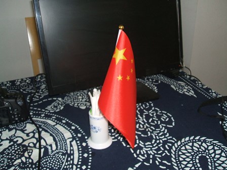 国慶節(中国の建国記念日)の日の朝、ミニ国旗を配っていました。