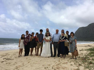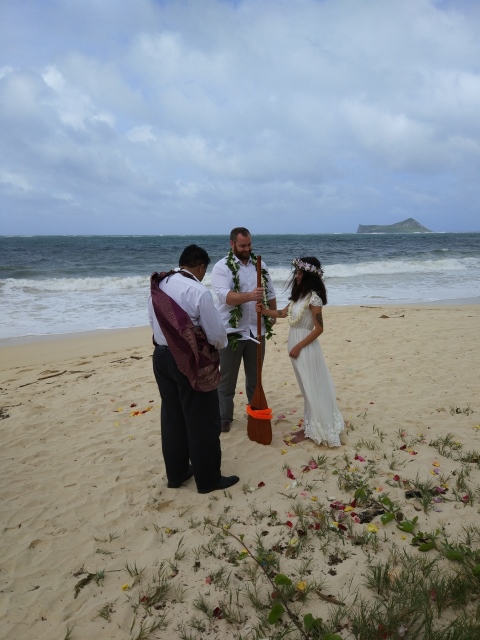 ビーチで、ハワイの伝統的な司祭さんに来ていただいて、