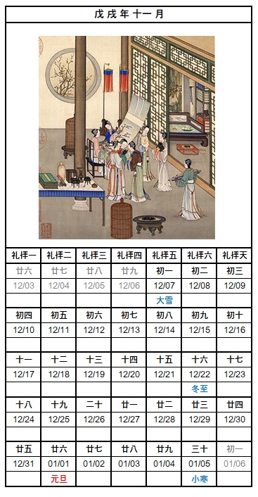 戊戌年十一月新旧対照カレンダー