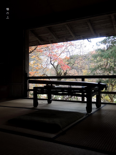 このところの降霜でもみじの葉が例年より少ないのは残念です。この紅葉も昨週には散り果ててしまいました。この「楼の上」(ろうのうえ、山居東の対)下の田も収穫を終え新たな「いのちのはる(張る→春)」季節に向けて静かに時を過ごしています。