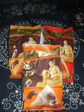 お肉と、お肉と味付け卵、(日本のおこわ風)、アズキ餡の3種類。