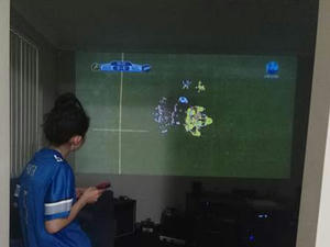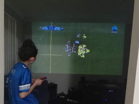 着ているのは、アメフトのデトロイト・ライオンズのレプリカ。